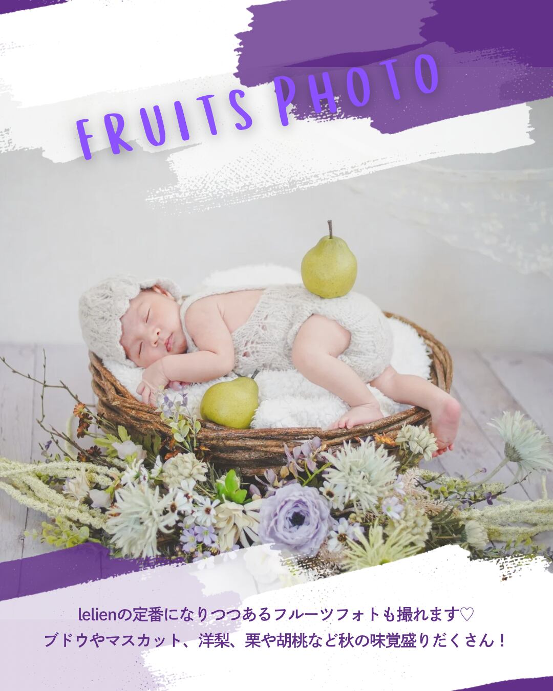 ル・リアンで定番となりつつあるフルーツアートは、秋の味覚「ぶどう、洋梨、栗&胡桃」を合わせます。つるかごの下に散らばせたり、つるかごの上に置いたり、ベビーに持たせたり…。可愛いこと間違いなし!秋色フォトをお楽しみくださいね!