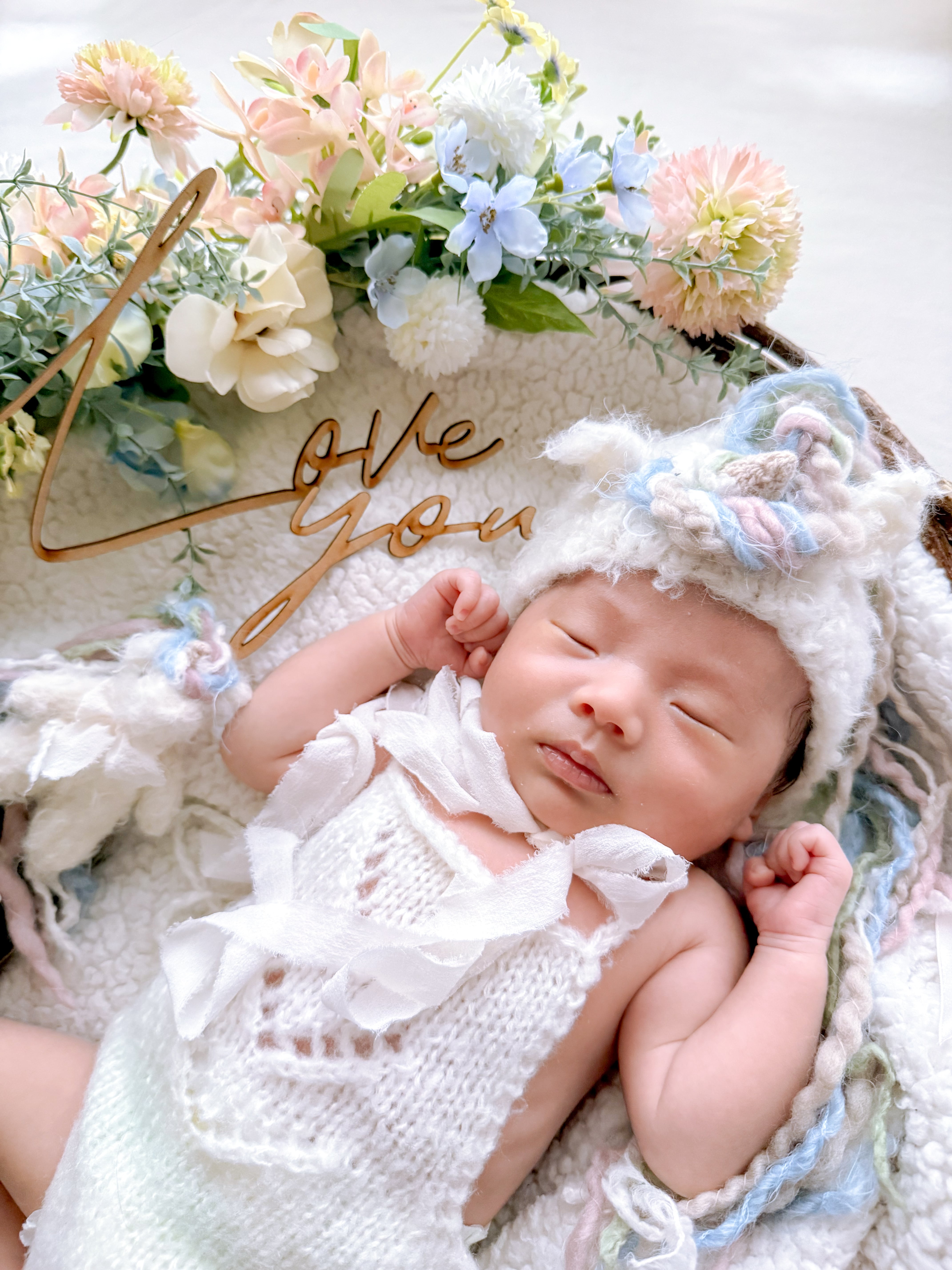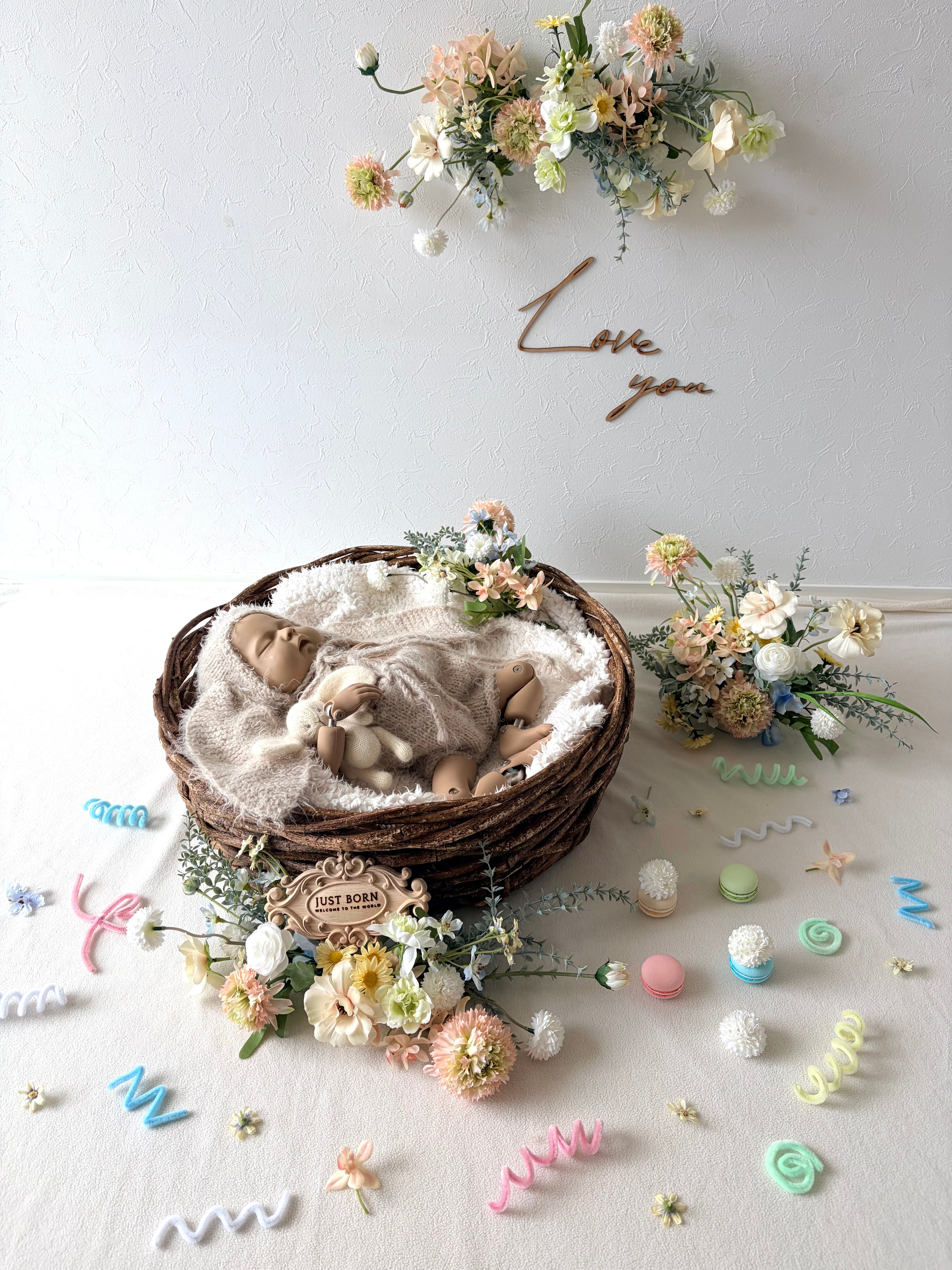セルフニューボーンフォト、ニューボーンフォト衣装、ニューボーンフォトかご、新生児フォト