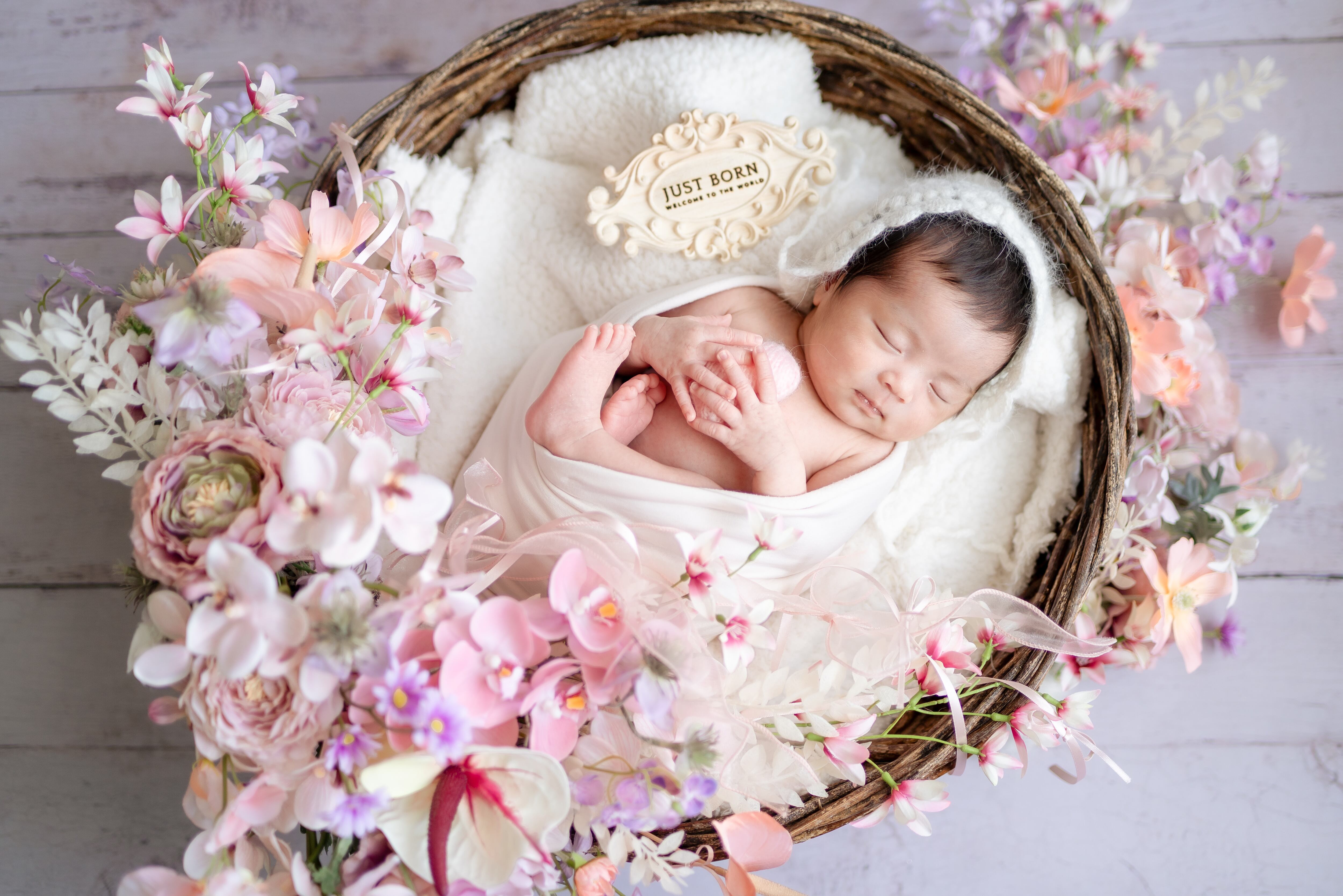 セルフニューボーンフォト、ニューボーンフォト衣装、ニューボーンフォトかご、新生児フォト